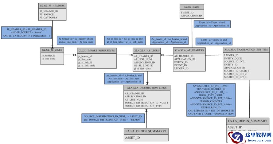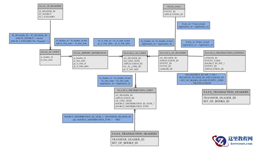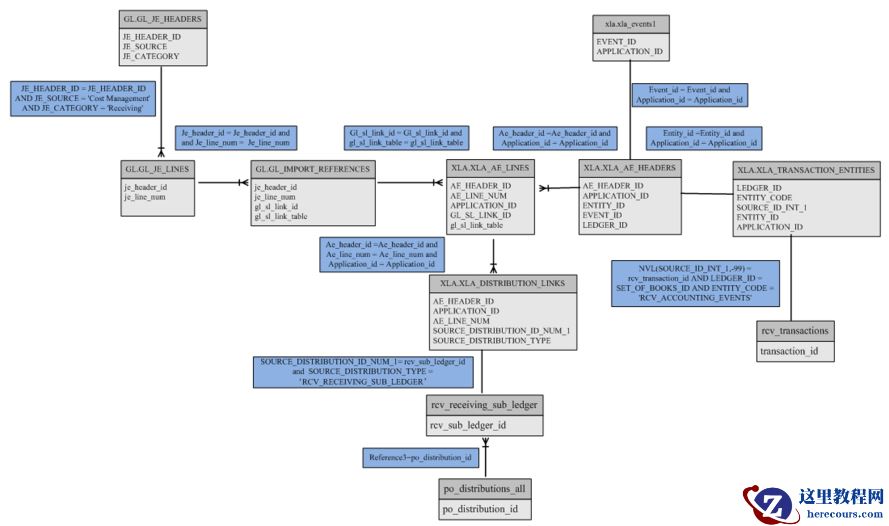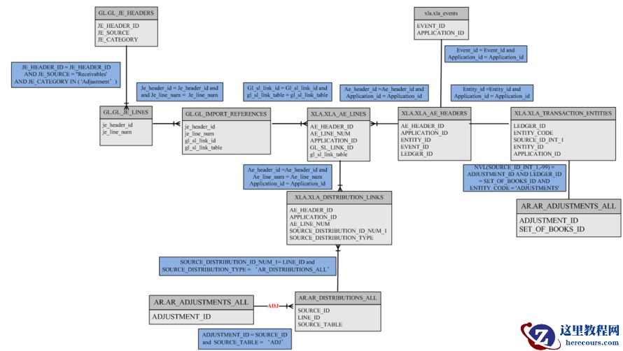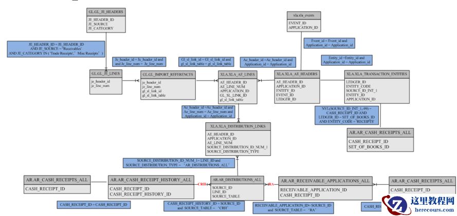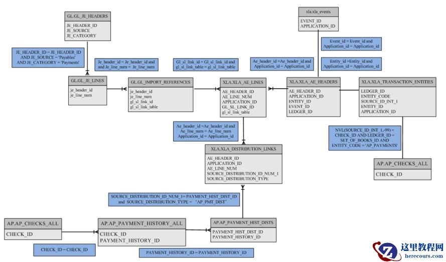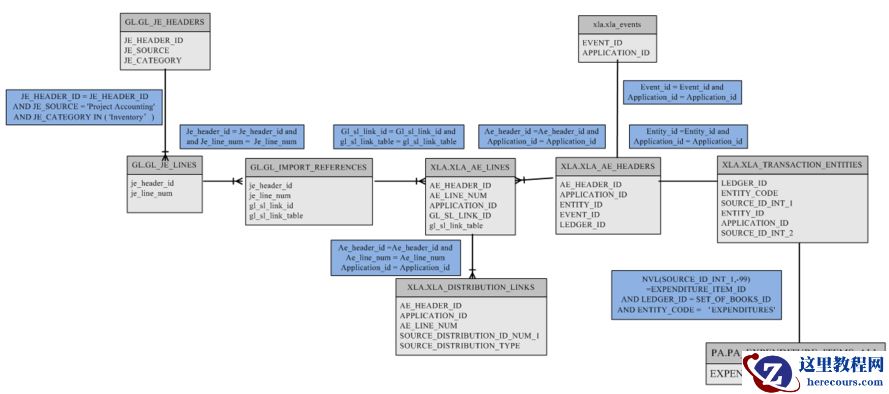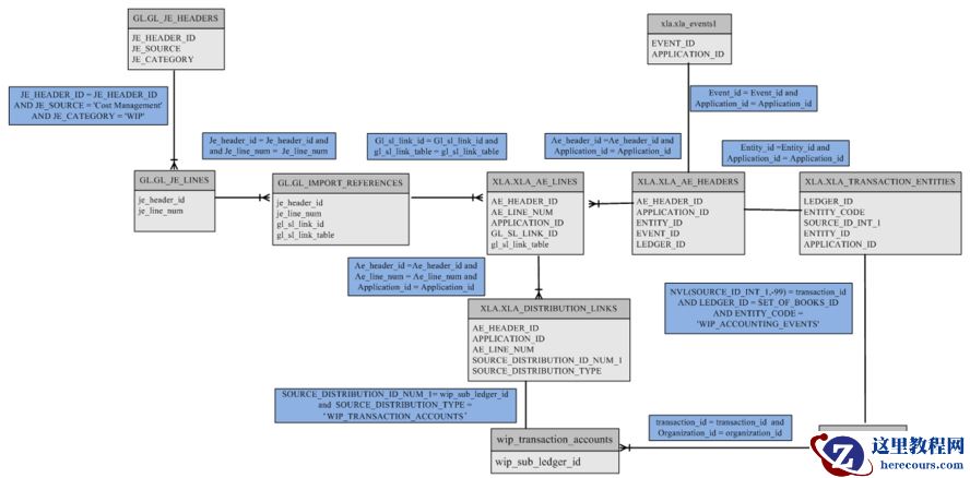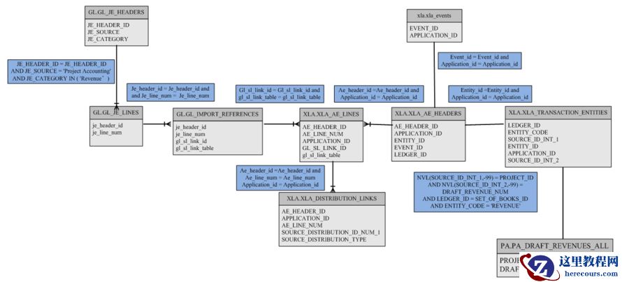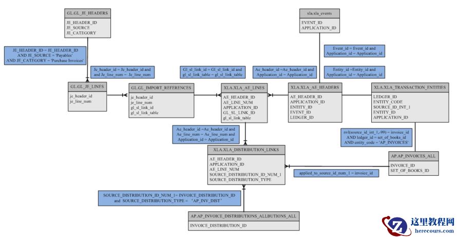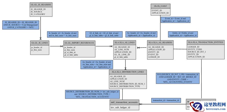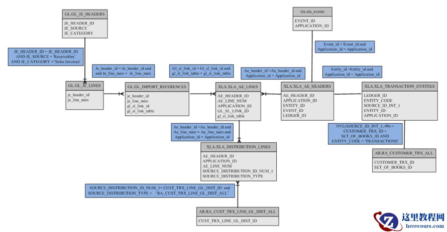 在 SLA 中技术方面最常用的就是日记账来源追溯,在追溯的过程中从 GL 到 SLA 和 11i 差别不大,都是通过 gl_import_references 表来进行,该表的 je_batch_id , je_header_id , je_line_num 是和 GL 关联,该表字段 gl_sl_link_id 是和 SLA 中的行表 (XLA_AE_LINES) 关联,在 SLA 中重要的几张表如下 :