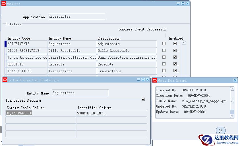 该界面的 Entity Code[ 实体代码 ] 对应 xla_transaction_entities 表中的 ENTITY_CODE 字段,每个来源就标示了该子分类账是哪个模块产生的。点击 Identifiers[ 标示 ] 进入如下界面:该界面中的 Entity Table Column[ 实体表列字段 ] 是子模块相关源表的字段, Identifier Column[ 标示列 ] 就是 SLA 中 xla_transaction_entities 表的列, SLA 和各子模块的联系就是通过该界面的设置来完成的。