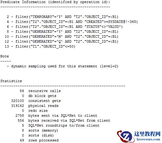 --- 说明:案例来自《 收获,不止SQL 优化 》 创建测试数据: SQL > drop table t1 purge ; SQL > drop table t2 purge ; SQL > create table t1 as select * from dba_objects ; SQL > create table t2 as select * from dba_objects ; SQL > update t2 set status = 'INVALID' WHERE ROWNUM <= 10000 ; SQL > update t2 set generated = 'Y' WHERE ROWNUM <= 10000 ; SQL > update t2 set temporary = 'Y' WHERE ROWNUM <= 10000 ; SQL > update t2 set temporary = 'M' WHERE temporary <> 'Y' ; SQL > update t2 set temporary = 'Q' WHERE temporary <> 'Y' or temporary <> 'M' ; SQL > COMMIT ; SQL > set autotrace traceonly SQL > set linesize 1000 原 SQL :