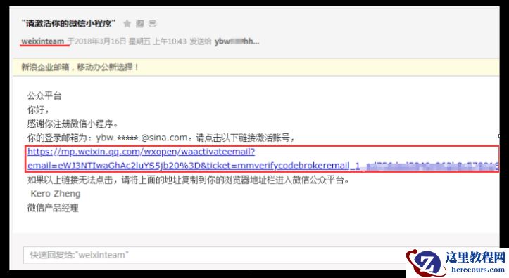 5.进入您的邮箱查看来自微信的激活邮件,打开它,点击链接激活账号