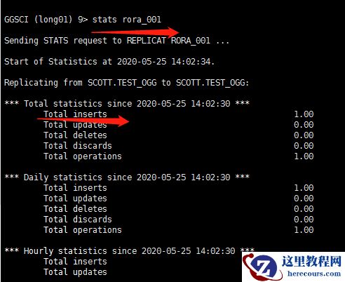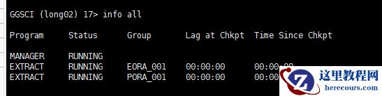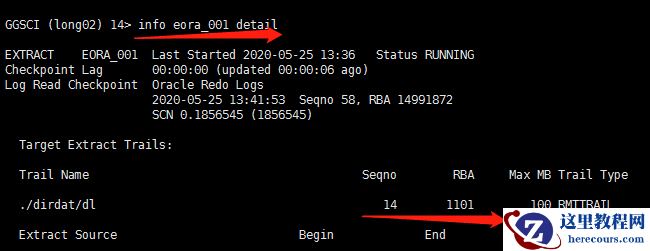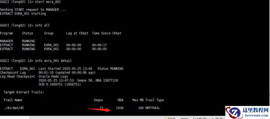 3 测试,源端date pump进程修改:alter eora_001 ETROLLOVER,修改前插入测试数据不提交 修改前检查相关信息: