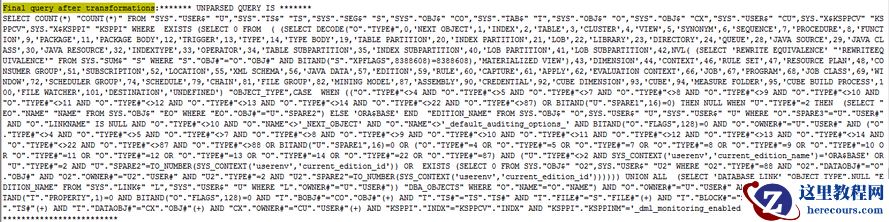 SELECT COUNT(*) "COUNT(*)" FROM "SYS"."USER$" "U", "SYS"."TS$" "TS", "SYS"."SEG$" "S", "SYS"."OBJ$" "CO", "SYS"."TAB$" "T", "SYS"."OBJ$" "O", "SYS"."OBJ$" "CX", "SYS"."USER$" "CU", SYS."X$KSPPCV" "KSPPCV", SYS."X$KSPPI" "KSPPI" WHERE EXISTS ......;