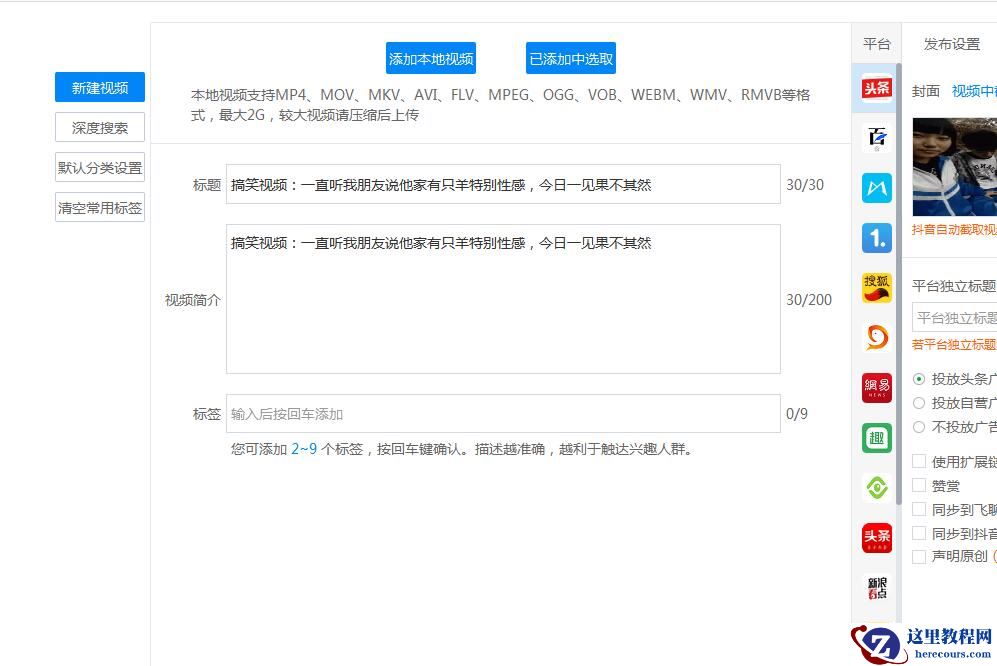 接下来来演示一键上传视频,首先,点下发视频(软件上方),有一个技巧,把“默认分类”这里填好,再本地添加一下你想要发的视频内容,不能忘了填入标题简介和标签。完成以上操作就可以,鼠标左键点击发布(可下载看下具体位置),会来到勾选账户弹窗处,选中想发的账户,就这么完成了全部发布,有没有觉得发内容其实很简单?