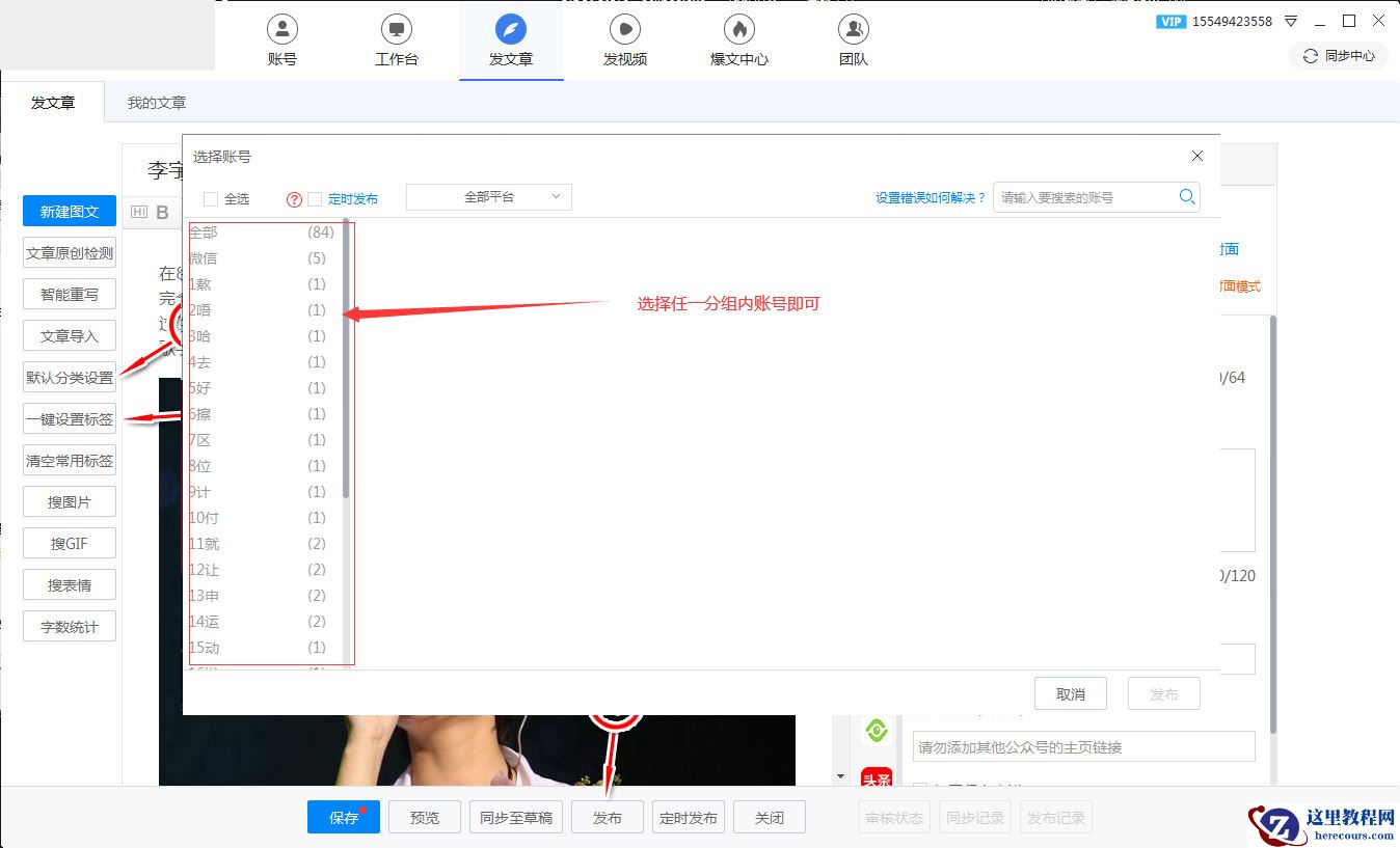 来演示一键分发图文,点击发文章按钮,如果初次用,最好先把默认分类设置好,之后发文的时候自动帮你填充好分类,在编辑框把内容导入,点击一键设置标签(在编辑器左侧),点击一键设置封面,假如你个别平台需要单独设置一下,点击编辑器右侧对应平台设置一下就好了,只剩最后一步发布了,点一下发布(最下面),会进入账号选择界面,选好你要发的文组就一键分发好了。