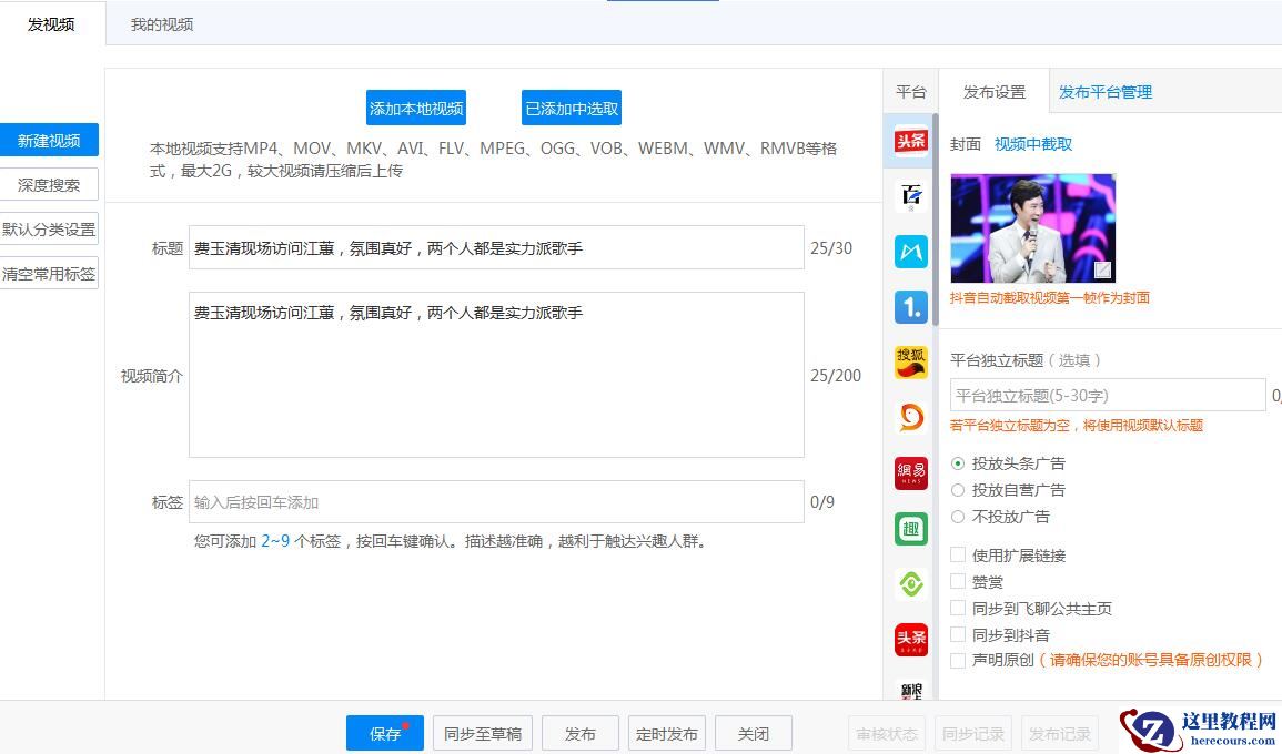 下面来演示如何一键分发短/小视频,鼠标在“发视频”处单击,为了节省以后的时候,这里先把默认分类设置好,再添加一下制作好的视频内容,下面按要求填好标签标题等内容。当你填好了以后,鼠标在发布这儿点下,会进入勾选账户的弹窗,勾选要发的账号,就一键同步发送搞定了,是不是看着就很方便快速?