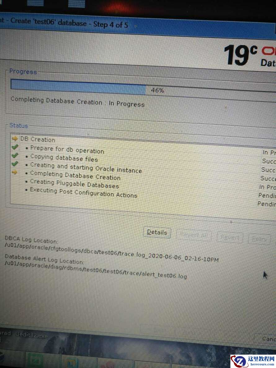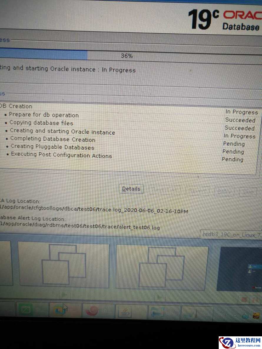 百度,mos都没有找到对应的解决方法,上班前去得早,查了一个多小时无果(真要纠缠下去,难度要开SR不成),后来想想,估计当时的环境是已经运行了一个CDB实例,然后再去dbca创建,是不是和这个有关,决定下次,不启动已有的htdb实例,然后dbca试试,果然到了今天顺利了,执行过程部分截图如下