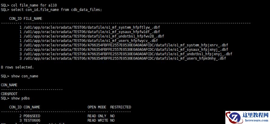 cdb_data_file视图也可以查看(不全,不包含PDB$SEED,只有新建的TEST0606,和系统