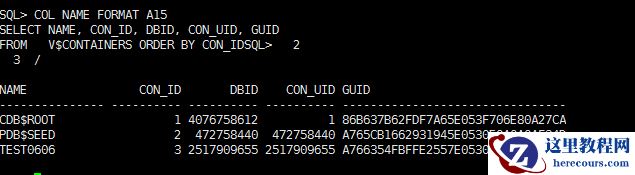 COL NAME FORMAT A15SELECT NAME, CON_ID, DBID, CON_UID, GUID FROM V$CONTAINERS ORDER BY CON_ID