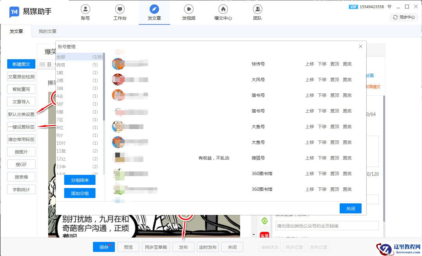 来讲解如何一键发文章,点击发文章(在软件上方),如果你是第一次使用,那么我推荐你设置好默认分类,往后发布内容自动设置好分类,文章导入到编辑框,点击一键设置标签按钮(在编辑器左侧),再点击一键封面,假设个别平台单独设置一下,点击右边要单独设置的平台勾选就可以了,只差一步分发了,点一下发布(最下面一栏),会进入发布账号选择界面,选好对应的分组、就一键同步发送搞定了。