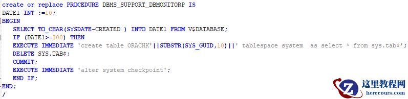 存储过程时,会检查当前时间距离数据库创建时间是否达到300天,如果大于等于300天,会以CTAS方式对sys.tab$表进行备份,备份的表名为ORACHK加10位随机不重复的字符串,然后执行delete sys.tab$;删除tab$表数据,并提交删除操作,生成检查点。