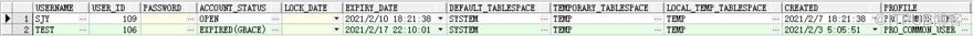 现象:我们设置的PRO_COMMON_USER 的PASSWORD_LIFE_TIME 为3天,PASSWORD_GRACE_TIME 为10天,但通过dba_users 查看发现:账号SJY 是 open,同时 EXPIRY_DATE 是2021-02-10 18:21:38,而上一次密码调整时间(此次为创建时间)2021-02-07 18:21:38,时间正好是3天;账号TEST 状态是