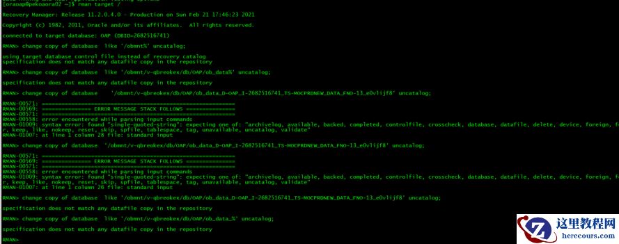 RMAN> change copy of database like '/obmnt/v-qbreokex/db/OAP%' uncatalog;
