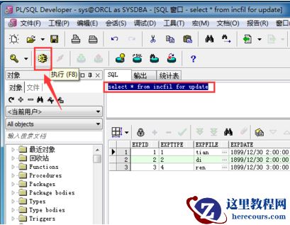 在SQL窗口中输入命令 select * from incfil for update,即修改表incfil的数据,输入完成后点击执行按钮或按F8执行,如图所示: