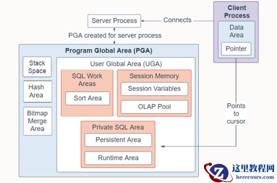 在共享服务器环境中,多个客户端用户共享服务器进程。 UGA 被移到大池中,只给 PGA 留下堆栈空间、散列区域和位图合并区域。