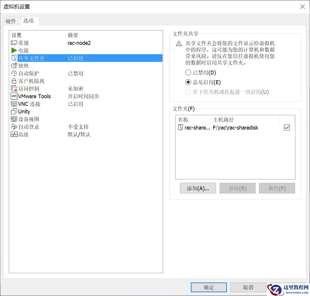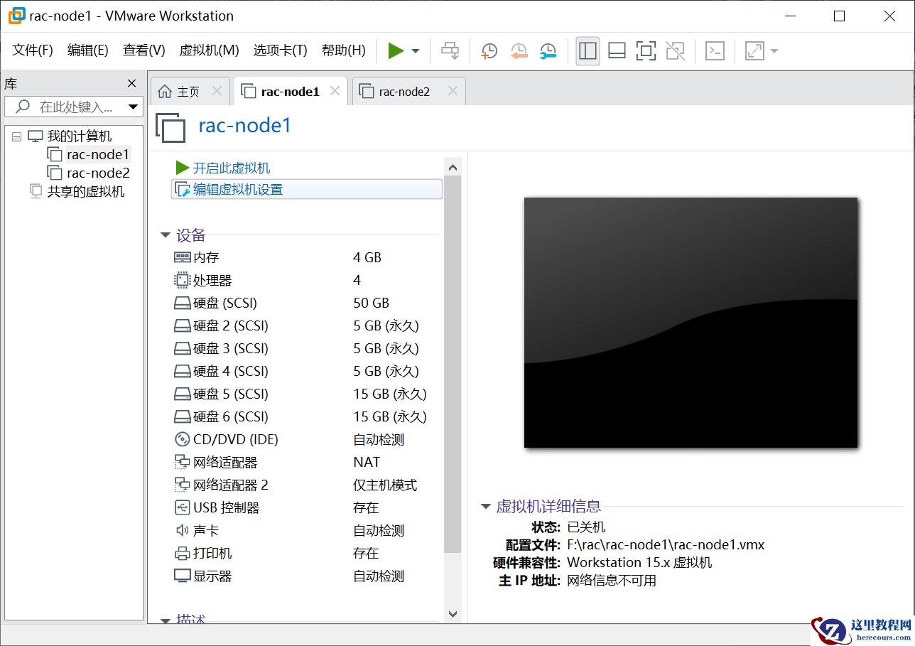 2.5 在末尾添加如下代码(共享磁盘路径根据实际路径修改): scsi1.present = "TRUE" scsi1.virtualDev = "lsilogic" scsi1.sharedBus = "Virtual" scsi1:1.present = "TRUE" scsi1:1.mode = "independent-persistent" scsi1:1.filename = "F:\rac\rac-sharedisk\ocr_voting_disk1.vmdk" scsi1:1.deviceType = "plainDisk" scsi1:2.present = "TRUE" scsi1:2.mode = "independent-persistent" scsi1:2.filename = "F:\rac\rac-sharedisk\ocr_voting_disk2.vmdk" scsi1:2.deviceType = "plainDisk" scsi1:3.present = "TRUE" scsi1:3.mode = "independent-persistent" scsi1:3.filename = "F:\rac\rac-sharedisk\ocr_voting_disk3.vmdk" scsi1:3.deviceType = "plainDisk" scsi1:4.present = "TRUE" scsi1:4.mode = "independent-persistent" scsi1:4.filename = "F:\rac\rac-sharedisk\fra_arc_disk.vmdk" scsi1:4.deviceType = "plainDisk" scsi1:5.present = "TRUE"