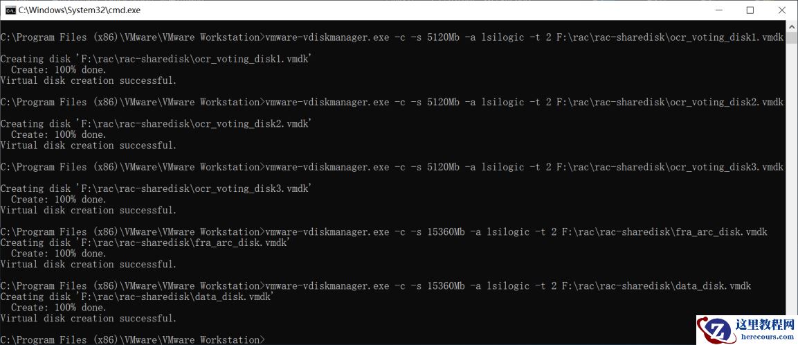 2.3 运行如下命令: vmware-vdiskmanager.exe -c -s 5120Mb -a lsilogic -t 2 F:\rac\rac-sharedisk\ocr_voting_disk1.vmdk vmware-vdiskmanager.exe -c -s 5120Mb -a lsilogic -t 2 F:\rac\rac-sharedisk\ocr_voting_disk2.vmdk vmware-vdiskmanager.exe -c -s 5120Mb -a lsilogic -t 2 F:\rac\rac-sharedisk\ocr_voting_disk3.vmdk vmware-vdiskmanager.exe -c -s 15360Mb -a lsilogic -t 2 F:\rac\rac-sharedisk\fra_arc_disk.vmdk vmware-vdiskmanager.exe -c -s 15360Mb -a lsilogic -t 2 F:\rac\rac-sharedisk\data_disk.vmdk