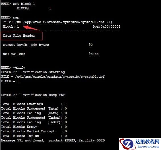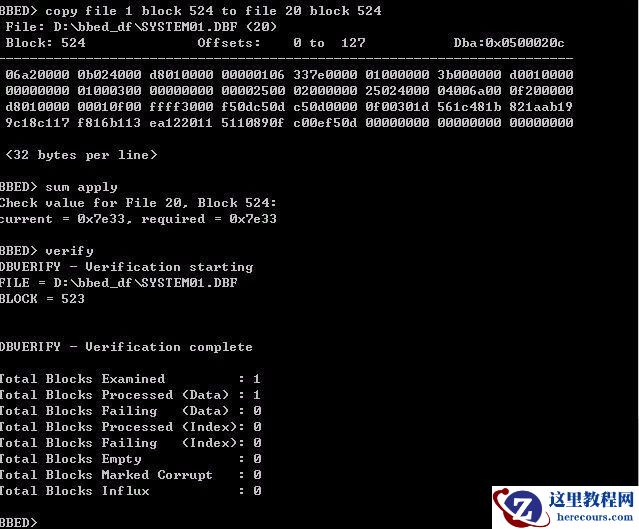 如上图,我们检查的是 文件20 块 524, 验证时, 写的system01.dbf 的块标识是523。