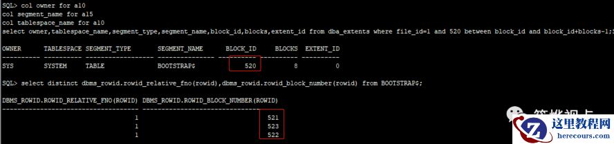 如上图,可以看到,对象 BOOTSTRAP$ 包括数据文件1的520-523块。