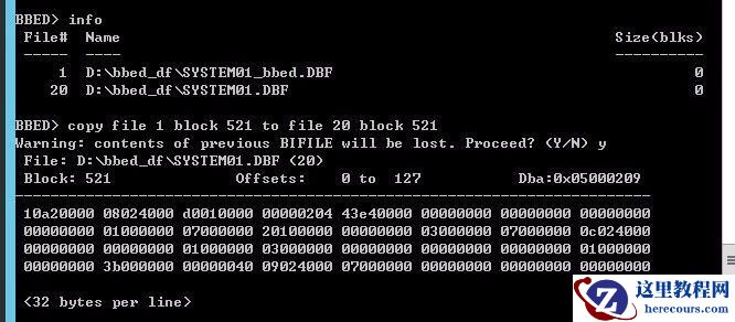 1 D:\bbed_df\SYSTEM01_new.DBF 20 D:\bbed_df\SYSTEM01.DBF set ORACLE_HOME=C:\app\Administrator\product\11.2.0\dbhome_1 bbed PASSWORD=blockedit mode=edit blocksize=8192 listfile=D:\bbed_win\bbed_1.txt copy file 1 block 521 to file 20 block 521 copy file 1 block 522 to file 20 block 522 copy file 1 block 523 to file 20 block 523 copy file 1 block 524 to file 20 block 524