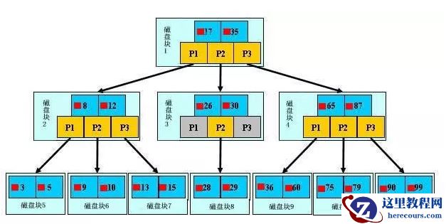 磁盘块 1 中存储 17 和 35 数据项,还有 P1、P2、P3 指针,P1 表示数据项小于 17 的磁盘块,P2 表示数据项在 17 和 35 之间的数据项,P3 表示数据项大于 35 的数据项。非叶子节点不储存数据,只储存指引搜索方向的数据项。我们知道每次 IO 读取一个数据页的大小,也就是一个磁盘块。假设我们要查找 29 这个数据项,首先进行第一次 IO 将磁盘块 1 读进内存,发现17 < 29 < 35,然后选用 P2 指针进行第二次 IO 将磁盘块 3 读进内存,发现26 < 29 < 30,然后选用 P2 指针将磁盘块 8 读进内存,在内存中做二分查找,找到 29,结束查询。通过分析查询过程,我们可以知道 IO 次数和 B+ 树的高度成正比。H 为树的高度,M 为每个磁盘块的数据项个数,N 为数据项总数。