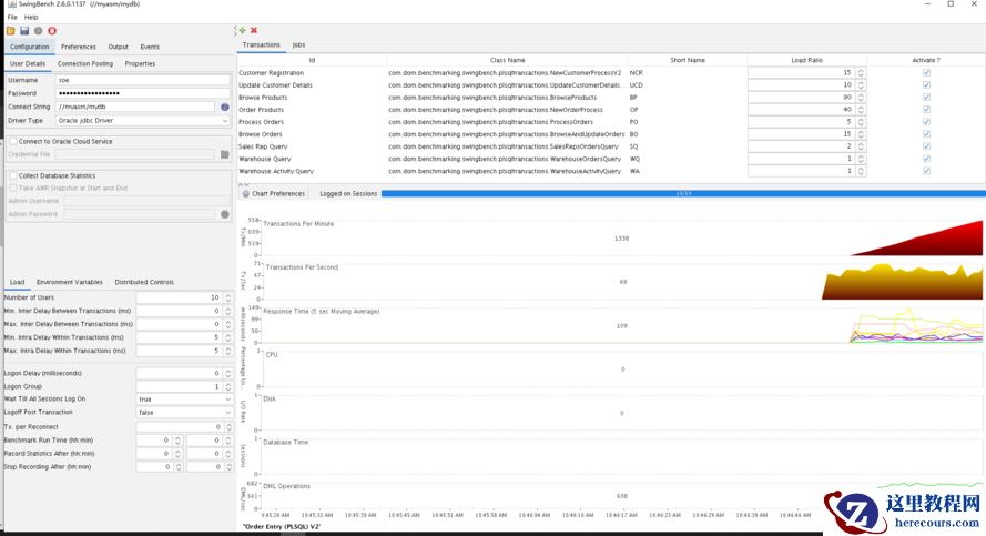 Swingbench 图形界面,用户可以编辑、配置相关参数,可以实时显示相关指标,如cpu、内存等