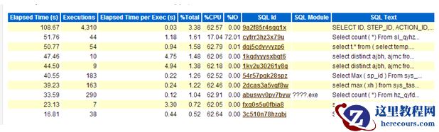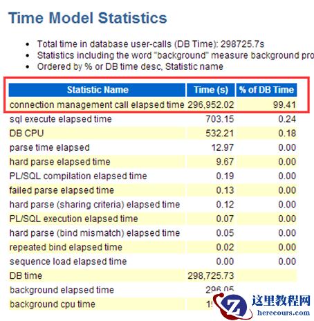 可以看到,故障时间99% 的CPU 都消耗在connection management call elapsed time 上面,也就是说,故障点的时候99% 的CPU 都消耗在连接上面,并且我们检查发现,在故障点发生的SQL ,和正常时间点发生的SQL ,存在很大的差别。