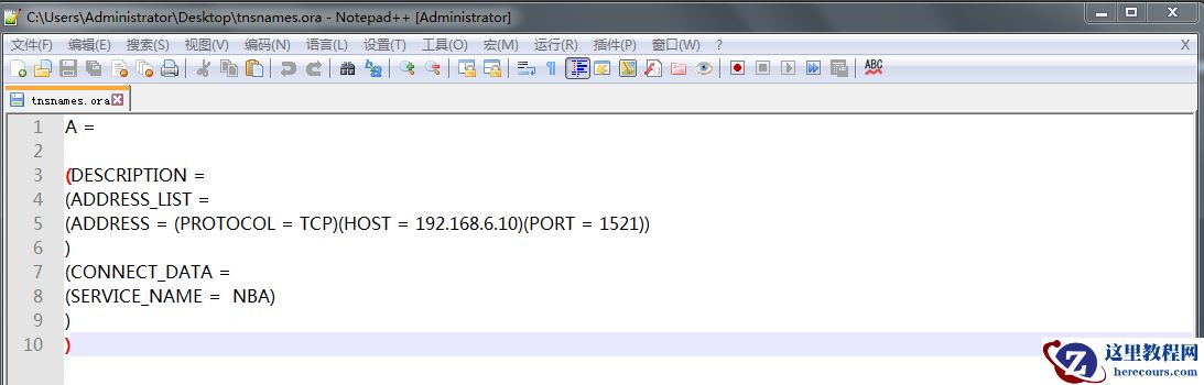 其中A是可以自定义的名称,用来自己识别所连接到是哪个数据库,真正的数据库实例名是SERVICE_NAME = NBA中的NBA,第一个等号"="后面的是数据库连接串.