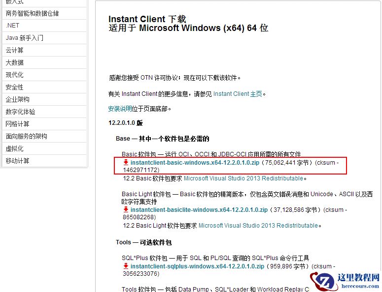 官网地址:https://www.oracle.com/technetwork/cn/database/features/instant-client/index-092699-zhs.html(见下图)
