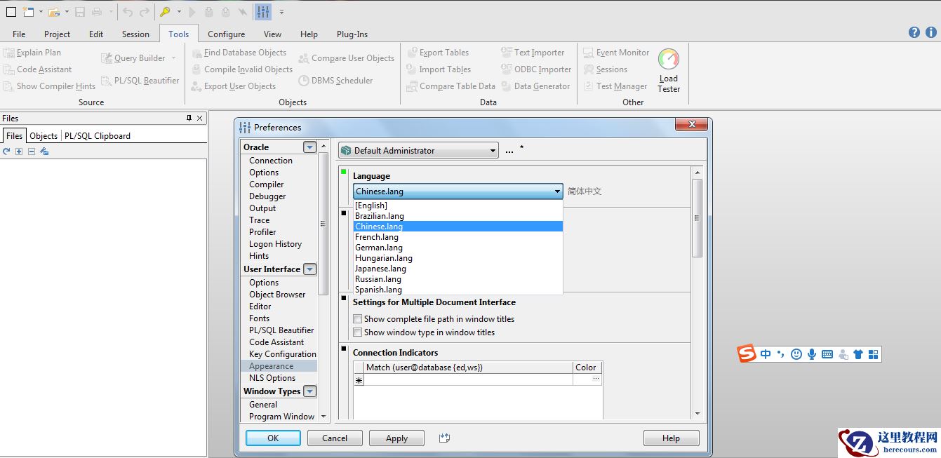 PLSQL界面语言设置:Preferences---->User interface---->Appearance----->Language---->Chinese.lang