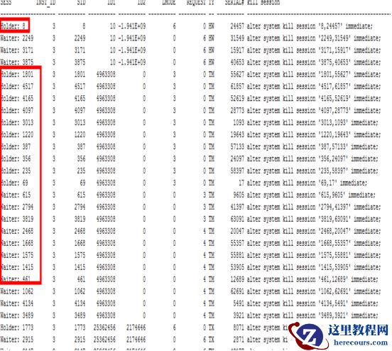 select b.*,a.serial#,'alter system kill session '''|| b.sid || ','||a.serial# ||''' immediate;' "kill session" from gv$session a,(SELECT DECODE(request,0,'Holder: ','Waiter: ') || sid sess,inst_id,sid,id1, id2, lmode, request, type FROM GV$LOCK WHERE (id1, id2, type) IN (SELECT id1, id2, type FROM GV$LOCK WHERE request>0) ORDER BY id1, request) b where b.inst_id=a.inst_id and b.sid=a.sid;
