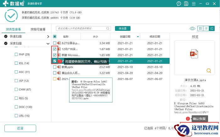 步骤2:文件开始扫描后,默认快速扫描模式,文件扫描完成后。可以看到文件扫描类型、文件名、大小以及最近修改时间等信息。双击可预览。