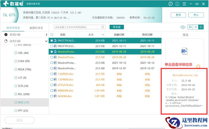 第三步:文件的恢复工作。在这里要注意文件最好不要保存在丢失的位置,很大几率会保存失败,我的建议是新建一个专门的文件夹存放这些文件。当然恢复出来的文件也会自成一个文件夹,方便大家进行辨认。