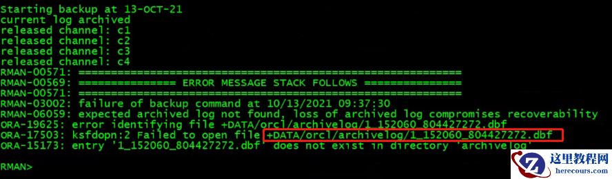 经过沟通确认得知,原来这套数据库因为DG备库不同步问题,主库手工执行过rm 删除归档,导致rman后续备份检查备份归档失败。通过rman手工清理expired归档之后,重新执行全库备份,发现备份归档的时候报错退出: