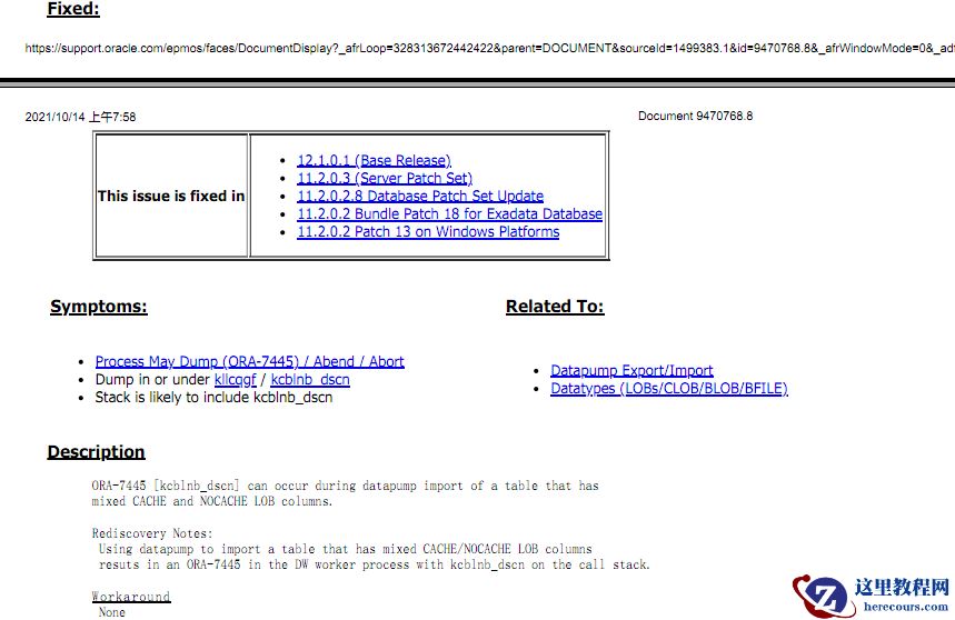 重新发起的rman备份和备份清理任务无法正常执行。 其次,rman物理备份无法执行后,退一步采用数据泵逻辑备份方式升级,但是,数据库泵impdp备份恢复测试时又遭遇了11.2.0.1的BUG 9470768 ORA-7445 from Datapump import /expdp a table with mixed CACHE and NOCACHE LOBs。impdp在对一个具有CLOB字段的大表进行导入时,提示报错stopped due to fatal error而退出: