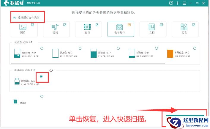 步骤一:在浏览器上找到数据蛙数据恢复专家的官网,在官网页面找到适合自己的设备的软件版本,完成下载安装后,运行软件,在首界面可以看到选择文件类型和位置的文字。将U盘插入电脑的USB插口,选择需要进行扫描的U盘和文件的类型。