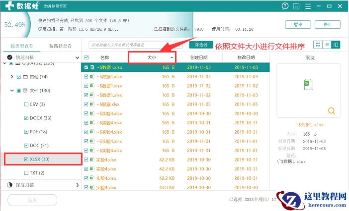 步骤二:当软件进入快速扫描后,会扫描出一些丢失的文件。这个时候如果你还想要扫描更多文件进行恢复,你可以进入深度扫描,你看也可以对文件进行预览,点击右上角三个图标,可以在上方根据文件的大小、创建时间等选项进行排序。