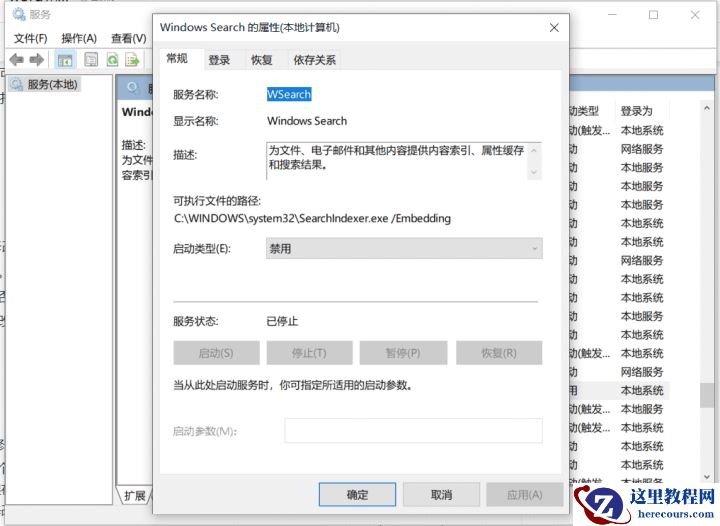 4.禁用windows搜索,在运行界面输入services.msc,找到Windows Search,双击,在启动类型选择禁用。