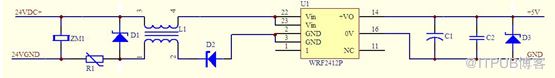 图 1 硬件电路框图 1.1 主控芯片 MCU芯片采用freescale公司的Coldfire-V0架构内核的32位处理器MCF51EM256,时钟频率最高可达50.33MHz,内置256K的Flash、16K的RAM、4个独立16位AD通道、3路定时器、3路SCI通讯接口、内置RTC时钟、I2C、SPI、KBI接口等多种资源,具有极高的性价比。 1.2 电源 AGP采用直流24V工作电源,使用广州金升阳公司的宽电压输入DCDC模块WRF2405P,工作温度范围-40~85℃、隔离电压3000VDC、实测输出纹波<1%,同时在电源输入部分设计加入放电管、PTC压敏电阻、TVS管、防反接二极管等器件(图2),具有过压、过流等保护。