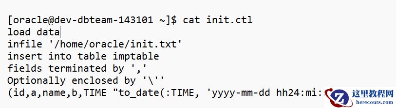 其次编辑一个init.ctl文件,这个是初始化的ctl。第一行是关键字 load data。第二行是待加载文件的绝对路径。第三行是指明insert的初始化动作。第四行是数据与数据的分隔符。当然最后一行也是最关键的,要与表的列一一对应,尤其可以看到时间类型的处理不一样。