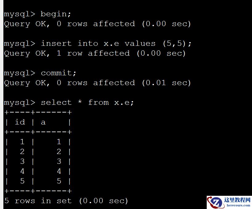 在开始事务以后,写入一条数据。并且提交了。那么就有5条数据。这和预期一样。