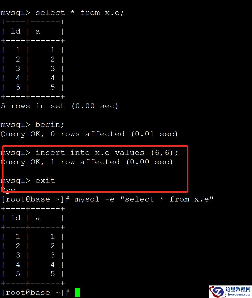 然而,在写入一条数据以后。执行了一个退出。即事务没有完成。那么这条数据在使用者角度中认为这是没提交。最终没有查到id为6的数据,符合预期。
