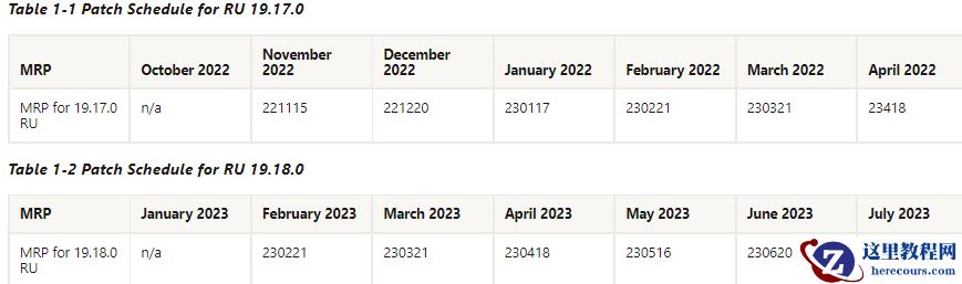 该MRP补丁表明,补丁34522319是一个Oracle数据库MRP,可以应用于RU 19.17之上,MRP发布日期为2022(年)11(月)和15(日),对应于2022年11月15日。下表显示了如何应用2022年10月18日发布的RU 19.17.0,然后用MRP更新该RU六个月的示例,从2022年11月开始,一直持续到2023年4月,19.17.0的最后一个MRP发布。在2023年5月,您将更新到2023年1月发布的RU 19.18.0,并使用RU 19.18.0的2023年4月或2023年五月MRP更新RU 19.18.0。在表格中,n/a指定MRP不适用的月份,因为它更新的RU没有发布。