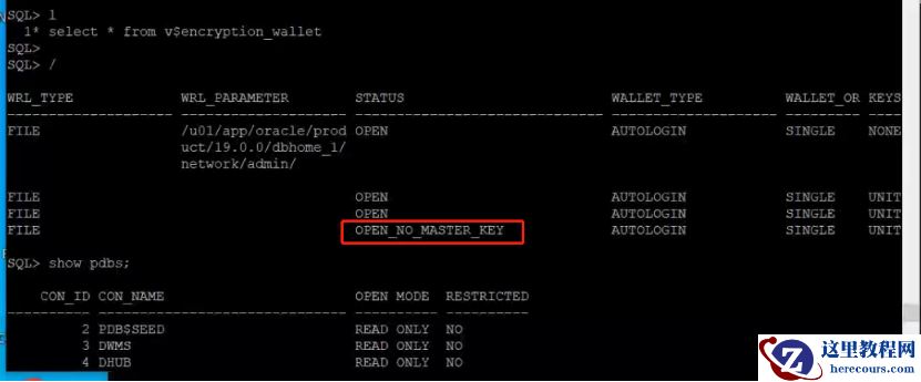 由于日志提示在备库钱夹目录不存在master key,因此率先在DG环境上检查密钥文件ewallet.p12、cwallet.sso,经过确认master key文件确实存在。 根据当前反馈信息,那么DG同步问题不应该是TDE透明数据加密引起。谨慎起见,通过sqlplus连到19C 多租户环境,确认其中一个PDB加密钱夹状态确实异常,提示no master key。