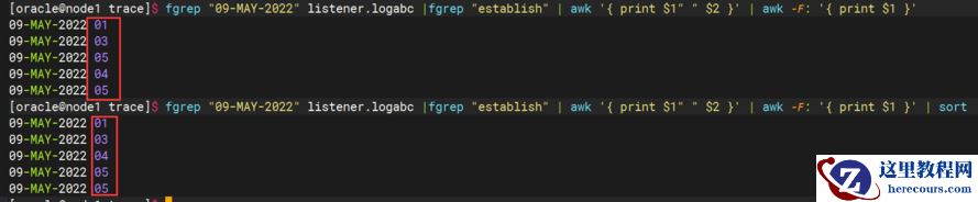 fgrep "09-MAY-2022" listener.logabc |fgrep "establish" | awk '{ print $1" " $2 }' | awk -F: '{ print $1 }' | sort
