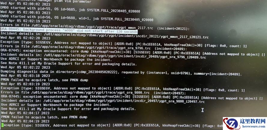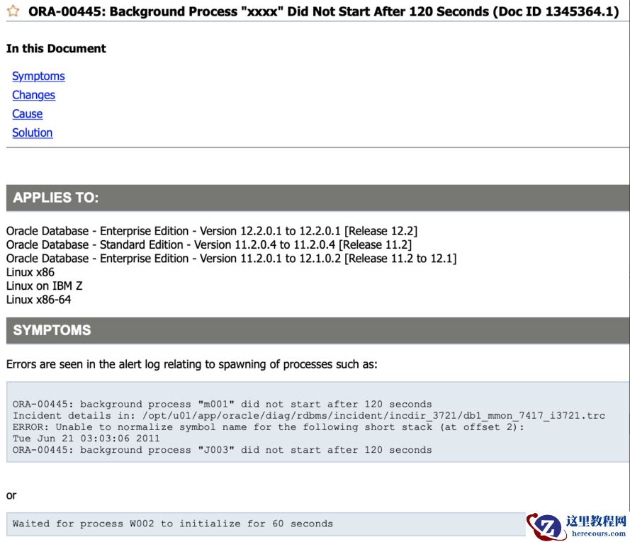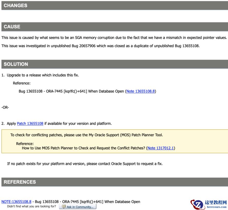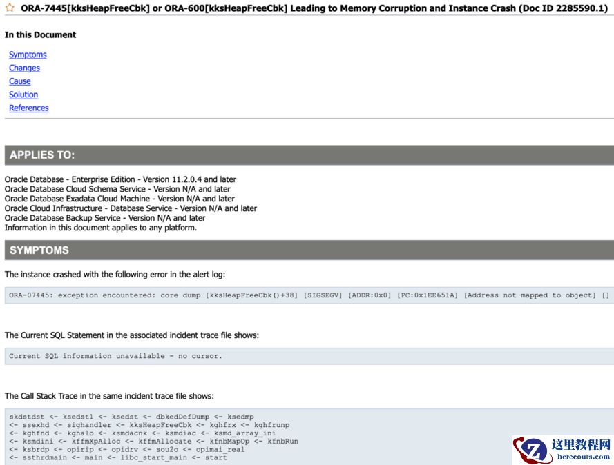 本次 ORA -07445 为 ORA- 0 0445 后产生的,建议优先调整 ORA -00445 ,两者均为内存类报错,如果 kernel.randomize_va_space 、 kernel.exec-shield 调整后,依然存在 ORA -07445 ,可根据 MOS 信息打补丁, Bug 号 13655108