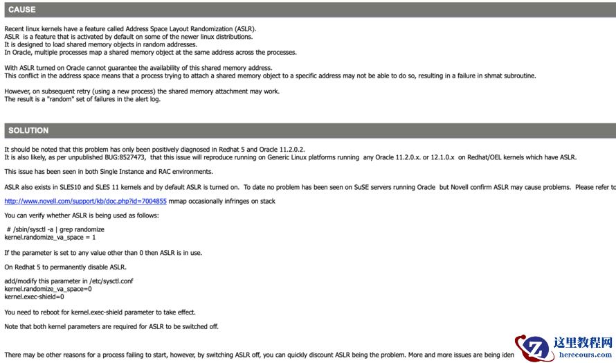 L inux 的特性 Address Space Layout Randomization ,该特性在最新的 linux 版本中都是激活的, oracle 多个进程在进程上映射一个共享的内存对象,但是在 ASLR 中 ORACLE 并不能保证这些共享内存是有效的,在内存紧张的时候就会 oracle 就会出现相应的报警,建议将对应内核参数修改为 0 ,关闭 ASLR 特性,修改 kernel.randomize_va_space 、 kernel.exec-shield 无需重启操作系统、无需重启数据库