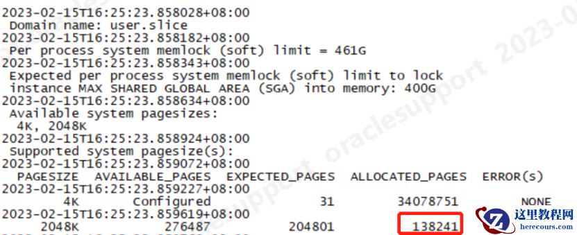 分析 Alert日志可以看出, vm.nr_hugepages设置为 138246,由于该数据库的 SGA配置为 400G, hugepages大页的内存页不足,进行 sga分配时,内存会通过大页内存( 2048k)和普通页( 4k)内存构成,日志信息如下: