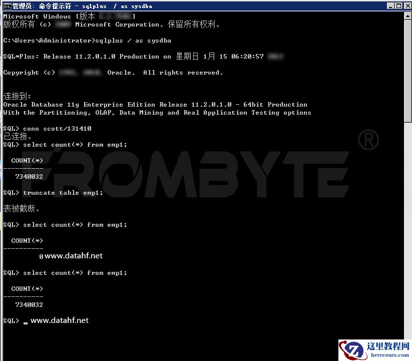 Oracle数据库数据恢复过程:1、为保护用户数据和重现故障的解决过程,北亚企安数据恢复工程师重构了与用户相同的故障:使用Scott用户创建表emp1,连续多次复制emp表,多次复制后的总记录数为7340032条。truncate表emp1,之后没有进行任何操作。查询该表,数据库中该表的记录为0条。