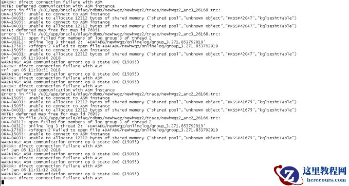 检查发现ASM实例shared pool空间不足,数据库无法连接ASM实例。