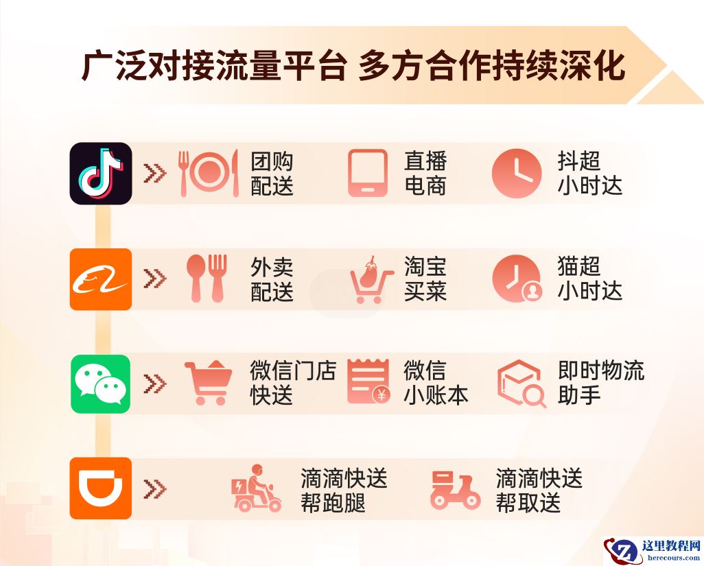 图源:中国政府网 港股研究社发现, 这其实体现了一种价值链思维——县域的消费生态组成,和一线城市在结构上差距并不大,都是由消费者、品牌商和本地商户、流量渠道和平台、物流配送服务商构成。而这些年,前三者已经有了和一线城市高度接近的成熟消费意识,唯有配送服务商,还只有龙头先抓住了县域市场的风口。 这个过程并不难理解,从消费者角度看,电商等业态早就深入县乡镇,线上下单的习惯已经养成。 从品牌商和商户角度看,由于中国供应链和交通的发展,各种业态都能高效下沉,其中尤以连锁店对县域市场的改变最深刻。因为连锁店带去了标准化的经营方式,像是瑞幸、喜茶、星巴克们,会在下沉时让消费者逐渐接受私域点单、即时配送的消费方式。 从流量渠道和平台角度看,抖音等全民化平台直接促进了消费热点泛化,让下沉市场群众也感受到一线城市消费者的日常生活模式,团购配送、直播电商加速渗透。 所以,我们不难推测物流配送服务商这一侧的趋势,只有先跟着供给和流量往下沉市场走的人,才会挖到第一层的金矿。来自一线的KA商家,会在下沉过程中希望和熟悉的服务商一起向县域进军,把成熟可靠的服务复制到下沉市场,这就带来了机会。
